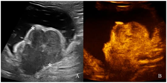 Additionally, in human medicine, CEUS technique was evaluated to assess gastric perfusion kinetics during gastritis and/or gastric cancers [43,44]. One study reported that gastric cancer showed a diffuse enhancement with delayed and lower PE compared to gastritis, without “comb teeth-like”, while this pattern was visible in most cases of gastritis [43]. In another recent study, qualitative and quantitative CEUS parameters were evaluated in patients affected by gastric adenocarcinomas, lymphomas, and GISTs, proving a strong correlation between gastric blood flow measured by the CEUS and measured by laser Doppler flowmeter [44].