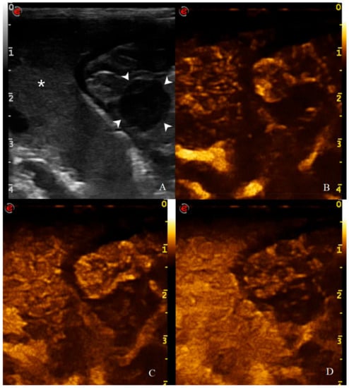 CEUS examination of the same dog during the peak enhancement of the time-intensity curve. CEUS enhancement pattern in a canine adenocarcinomas: (A) before contrast medium (CM) injection (0 s), the gastric mass (14 mm—arrowheads) and the adjacent liver parenchyma (asterisk) are visualized; (B) after CM injection (13 s), uptake occurs at the same moment at gastric wall and liver and the mass is classified as isoenhancing; (C) at peak enhancement time, contrast uptake is higher at the lesion margins and poor at its center and enhancement homogeneity is classified as heterogeneous; (D) in wash out phase (23 s), the enhancement decreased at gastric wall but persist in the adjacent liver.