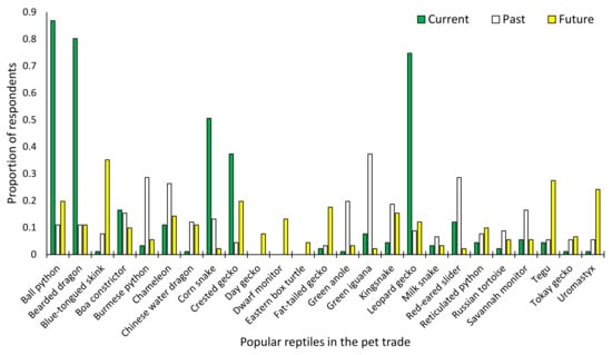 For this study, the current, past, and future trends of the most common and popular reptiles in the reptile pet trade were examined. First, an online survey was conducted and targeted to individuals involved in the reptile trade to determine what they believed to be the current, previous, and future popular reptiles. Google Trends was then used to establish the global popularity of reptile pets from 2004 to 2020 and compared to the survey results. To determine whether pet reptile trends differed among countries and regions, the five most popular pets and those predicted to be more popular in the future were also examined across countries with Google Trends. Since background information on the most common pet reptiles is lacking in the scientific literature, a general overview of the most important pet reptiles in this study is discussed.