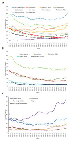 In the survey, the reptiles most frequently cited as the most popular, having lost popularity, and predicted to be popular in the future were searched worldwide in Google Trends from 1 January 2004 to 31 December 2020. Five reptiles were compared at a time, since this is the limit of total search items that can be compared in Google Trends. However, to obtain comparable trends for all reptiles, the most popular reptile was chosen and subsequently compared to different groups of four other reptiles to obtain relative temporal trend values. This is important, since Google Trends is a measure of relative search patterns and different comparisons will produce different results, as it is highly sensitive to the benchmark term used [38,46]. To smooth out noise and visualize long-term trends from the samples, a yearly moving average was used. This also smoothed out the seasonal fluctuations, since reptiles were typically searched for more often in summer than in winter. Since words can have multiple meanings, search topic “Reptiles” was used. Using search topic improved the results by capturing the semantics of the search words and included all variations, such as misspellings, spelling variations, synonyms, plural or singular versions, different languages, and special characters. To further filter results to the correct context, the category of pets was chosen. The five current and future popular reptiles were also examined for the last five years and compared across countries, in the same way as described. To ensure equal comparisons, reptiles that typically comprise more than three species (e.g., chameleons) were excluded in this analysis.