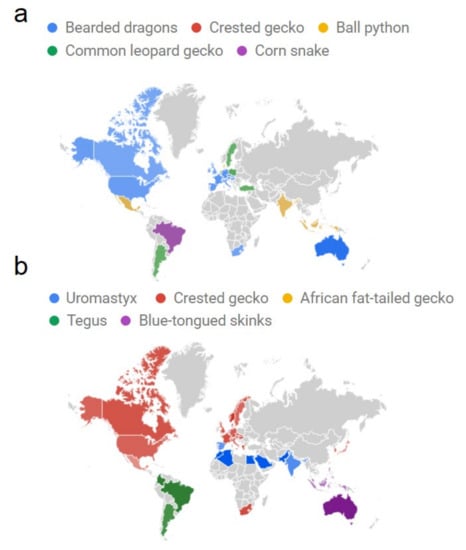 The reptile pets (a) most popular during the last five years and (b) growing in popularity, by country as indicated by Google Trends. Color intensity represents the percentage of searches relative to the reptiles compared.