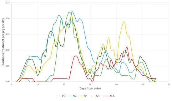 Diarrhoea treatments per pig can be seen in Figure 1 and accumulated diarrhoea pen treatments in Figure 2. There was a peak in diarrhoea treatments per pig starting around day 10 until day 30 in the NC, SP, and SB pigs, whereas the PC and XLA pigs only had a small peak around day 24. Additionally, all dietary treatments had a diarrhoea peak late in the trial, at around day 35. In groups NC, SB, and SP, the pen treatments started at day 5 while the PC pigs did not receive any diarrhoea pen treatments in the 14 days where the medicinal ZnO was included in the feed. For the XLA pigs, almost no diarrhoea pen treatments were given before day 24.