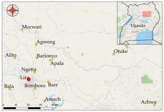 Sources of animals slaughtered at Lira Municipal abattoir in Uganda, Africa. The abattoir location is marked by the red dot. Sampling locations were reclassified into three regions: Southern (Achwa, Amach, Bala, Boroboro), Eastern (Apala, Barr, Otuke), and Northern regions (Agweng, Alito, Barlonyo, Mocwari, Ngetta).
