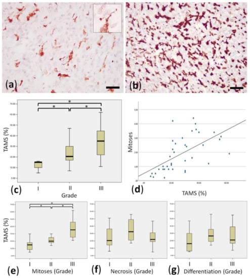Morphological features of TAMs in canine soft tissue sarcoma, and their associations with grade. (a) Iba1-positive TAMs in a case with moderate TAM infiltration. Inset: often TAM exhibited dendritic-like cytoplasmic elongations. Scale bar: 50 microns, indirect immunoperoxidase. (b) Iba1-positive TAMs in a case with marked TAM infiltration. Scale bar: 50 microns; indirect immunoperoxidase. (c) Significant difference (“*”) in the median of % of TAM infiltration in different Grades. Scale bar: 50 microns; indirect immunoperoxidase. (d) Linear correlation between the average number of mitoses in 10 high-power fields (HPFs) and % of TAM infiltration. (e) Significant difference (“*”) in the median of % of TAM infiltration in different Grades considering only mitoses as grade component. (f) Lack of significant difference in the median of % of TAM infiltration in different Grades considering only necrosis as grade component. (g) Lack of significant difference in the median of % of TAM infiltration in different Grades considering only differentiation as grade component.