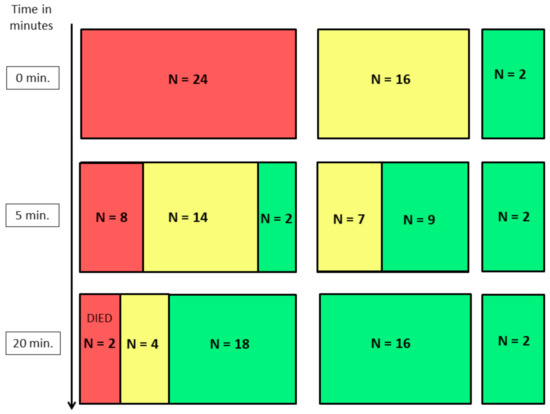The following results of Apgar score assessments in puppies classified as critical (AS ≤ 3), weak (AS 4–6) and normal (AS ≥ 7) immediately after birth (0 min). red rectangles—newborns with Apgar score < 4; yellow rectangles—newborns with Apgar score 4–6; green rectangles—newborns with Apgar score > 6.