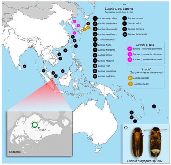 With the description of Luciola singapura sp. nov., there are now 53 nominal species in the genus Luciola throughout the SE Asian and Australopacific region including species from Luciola s. str. Laporte and Luciola s. lato sensu Ballantyne. We expand the definition of Luciola s. str. in this region to comprise 20 species including the new species, Luciola singapura sp. nov. The provisional inclusion of Luciola jengai (see remarks in [3], p. 96), L. papariensis, L. tsushimana, and L. unmunsana may change following future taxonomic investigations.