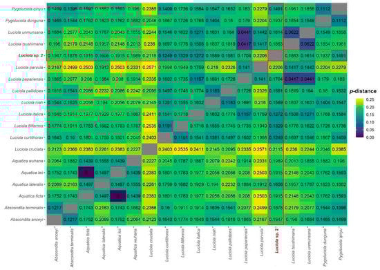 Heatmap of uncorrected p-distances among Luciola sp. 2 and closely-related taxa based on COX1.