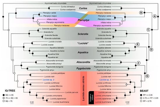 Both ML and BI topologies inferred largely similar topologies except for minor differences within the Pteroptyx/Inflata clade, which also had weak support in both phylogenies (Figure 3). Despite similar topologies, branch support along the backbone of the BI phylogeny was significantly stronger compared to the ML phylogeny. The genus Luciola was paraphyletic with strong support—L. owadai and L. cruciata from Japan were recovered as the sister lineage to the genus Aquatica, while other Luciola species formed a clade that was sister to the Pygoluciola + Abscondita clade. The latter Luciola clade corresponds to Luciola s. str. proposed by Ballantyne and Lambkin [8]. The genus Pteroptyx was also paraphyletic with regard to the genus Inflata. Luciola sp. 2 formed a clade with L. curtithorax and L. filiformis with high support in both phylogenies. The ML phylogeny based purely on COX1 sequences was weakly supported and produced different topologies with regard to the genera Sclerotia, Pteroptyx, Curtos, and Asymmetricata, while relationships among Aquatica, Abscondita, Pygoluciola, and Luciola remained the same (albeit with weaker support). Luciola cruciata was also recovered as the sister lineage to the Aquatica clade with strong support. Similarly, L. sp. 2 was also recovered as the sister lineage to L. filiformis + L. curtithorax.