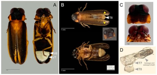 Males of Luciola singapura sp. nov. Habitus (A,B), head and pronotum (C); Tergite 8 after dissection (D). (A). Holotype male, from recent collection preserved in ethanol, light organ (LO) located on ventrite 6 (V6) and ventrite 7 (V7), presence of fat body along apex of suture, arrowed; (B). Habitus of paratype male. Coloration of paratype male collected 30 years ago preserved as dry specimen, arrow indicated presence of fat body along suture, tergite 8 (T8) from dorsal view and pronotum (inset); (C). Top: Head and pronotum of paratype male, below: Mouthpart and some parts of antenna; (D). Dissection parts of holotype male: tergites 7-8 indicated with aedeagus and aedeagal sheath.