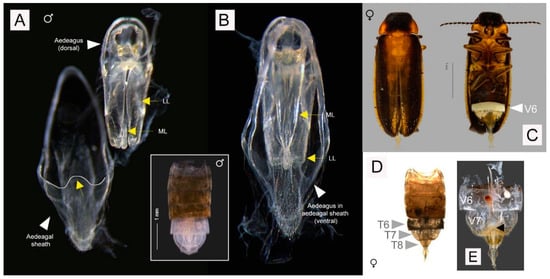 Aedeagal and aedeagal sheath of male (A,B) and diagnostic characters of female (C–E) of L. singapura sp. nov.; (A). Aedeagal sheath, dorsal view, median anterior margin of sheath tergite prolonged and apically truncated, outlined and arrowed; (B). Aedeagus, dorsal view and ventral view with arrow indicated median lobe (ML) and lateral lobes (LL); Inset: dorsal view of male abdominal tergites showing aedeagus with aedeagal sheath and tergite 8 still intact; (C). Habitus, dorsal and ventral view, LO on V6; (D). Dorsal view (after tissue clearing, before dissection), tergites 6-8 indicated; (E). Ventral view, dissected part, arrow showing posterior margin of V7 widely emarginated.