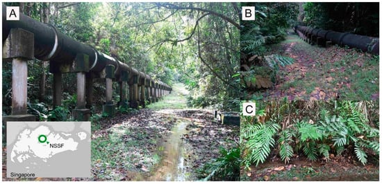 Singapore is the second smallest country in Asia (~728 km2) and comprises four legally protected nature reserves covering approximately 4% of its total land area [23]. For this study, specimens were collected exclusively from the Nee Soon Swamp Forest (hereafter referred to as NSSF) which is part of the Central Catchment Nature Reserve (Figure 1). The NSSF is an important conservation site that is rich in biodiversity and is the only remaining patch of primary freshwater swamp forest in Singapore [26].