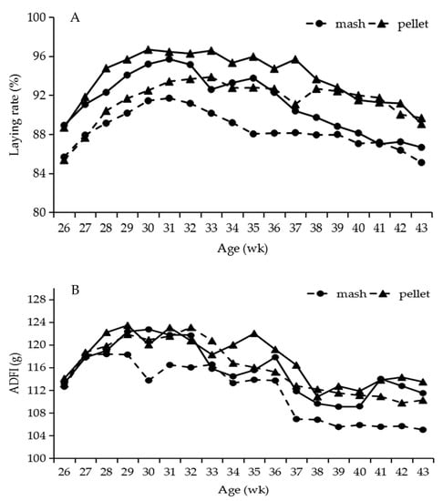 Laying rate (A) and ADFI (B) of two breed laying hens fed pellet and mash diets from 26 to 43 weeks of age. ADFI = average daily feed intake. Dotted lines represent Hy-line grey, solid lines represent Hy-line brown.