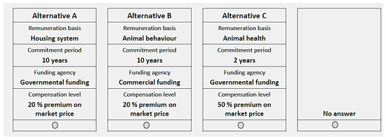 Table 1 shows the animal welfare program attributes and attribute levels included in the choice stimuli. We derived the four attributes and their levels from qualitative interviews conducted at the end of 2015 (cf. [41]), supplemented by the recent literature, and from the German FAW approaches mentioned above. The attribute ‘object of remuneration’ defined the categories of FAW measures available for choice. The attribute levels involved all dimensions of measures for assessing animal welfare: environmental-based (housing system), animal-related (animal health and animal behaviour) and a bundle of environmental-based, management-based and animal-related (animal welfare criteria) measures. The rationale for the attribute levels was previous own research, which demonstrated that German livestock farmers consider animal health an important indicator of animal welfare, that they are open to new housing systems improving animal welfare [43], and that they also include animal behaviour when evaluating the well-being of their animals [41]. The naming of the attribute level “animal welfare criteria” was derived from the ITW’s naming of their FAW program measures (in German: ‘Tierwohlkriterien’) and describes a bundle of FAW measures which can be implemented within existing housing systems. The fact that this attribute level also contains aspects of the other attribute levels was deliberately accepted, since the emphasis here was on the combination of criteria from different dimensions. The attribute levels of the attribute ‘commitment period’ were determined against the background that implementing higher animal welfare standards represents a certain financial and organisational burden for farmers. Therefore, we chose two years as the minimum commitment period. This is one year less than the (maximum) commitment period of the German animal welfare approach ‘Initiative Tierwohl’. We offered a commitment period of 10 years as the second attribute level, since long-term planning security might be one aspect influencing the implementation of FAW measures [43]. To identify potential preferences for governmental or commercial regulation of FAW standards, these two alternatives were provided as attribute levels of the attribute ‘funding agency’. The two levels for the attribute ‘compensation level’ were derived from the pricing of the marketing company for ‘Neuland’ products that offers farmers participating in the program a fixed price for one year with a premium of 20–50 percent on the market price [44].