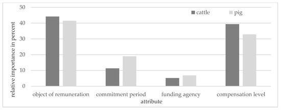 The major importance of the object of remuneration might be explained, on the one hand, by the fact that farmers might have considered that the implementation of higher FAW standards puts a certain organisational and financial burden on them. This burden depends to a large extend on the measures that serve as the basis for assessing FAW and thus for remuneration, as these measures determine the adjustments of the production system, the production processes and the management to be made. The perceived ability to deal with these challenges decisively influence farmers’ acceptance of FAW approaches [54,55]. At this point it is important to note that the effort, i.e., labour and/or money, required to implement FAW measures, could be an important factor in the failure of voluntary FAW programs because the more effort and resources required to comply with a FAW program, the less farmers are willing to participate [14]. On the other hand, this attribute might have provided information on non-use values of the FAW programs and thus have been important for farmers’ decisions. Non-use values with regard to FAW refer to the value that farmers derive from economic goods related to the well-being of the livestock independent of any direct use, present or future, the farmer might make of the animals [23]. A relevant type of non-use values refers to the self-perception of farmers: Several studies show, that farmers are more satisfied and enjoying their work if they feel their animals are well treated and healthy [22,23,56,57]. Results of a study by [56] indicate that nonmonetary factors related to internal esteem and taking pleasure in healthy farm animals can be as motivating to improve animal welfare as monetary factors.
