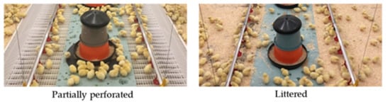 In Germany, broilers are conventionally kept on concrete floors equipped with organic bedding materials [1]. From day 14, about 80% of the litter’s dry matter (DM) consists of excrements and feed residues [2]. If the drying conditions are unfavorable, footpad dermatitis, hock burn, and plumage contamination occur [3,4,5]. As the abovementioned aspects lead to pain and secondary diseases, the incidence and severity are used as animal-based indicators to record animal welfare [6,7,8]. In addition, the litter provides a potential reservoir for antibiotic-resistant bacteria [9] that can be transmitted to humans via the food chain [10,11]. Two studies were carried out in the past comparing an innovative partially (50%) perforated flooring system with a littered flooring system [12,13]. One feature of the partially perforated flooring system is an elevated perforated area in the section of feed and water supply, accessible by perforated ramps. Next to the elevated perforated area, littered areas are available. The system provides access to two different floor types at different height levels and promotes the animals’ natural behavior such as perching and resting on elevated levels [14,15] or pecking, scratching, and dustbathing in contact with litter [16,17]. At the same time, animals are separated from at least 50% of the litter, which contains excrements, moisture, and bacteria. Adler et al. [12] examined the effect of the partially perforated flooring system on animal-based welfare indicators and production performance. The creation of different functional areas at different heights enriched the husbandry environment, increased the environmental complexity, and reduced animals’ general fear response, as confirmed by [18,19]. Furthermore, the separation of the animals from at least 50% of the litter had a positive influence on foot pad dermatitis and hock burn. Production performance was not affected by the floor type [12]. Heitmann et al. [13] studied the effect of the partially perforated flooring system on the occurrence of bacteria. A tendency was shown for a higher content of Escherichia coli (E. coli) in the supply area of the partially perforated system compared with the supply area of the littered flooring system. Owing to the elevated perforated area, the animals did not come into contact with the material containing E. coli underneath the perforated floor. Regarding the total bacteria count, a tendency for lower contents in the littered side areas of the partially perforated flooring system was found compared with the littered control barn. In summary, the partially perforated flooring system has a positive effect on health- and behavior-based welfare indicators without a reduction in production performance [12].