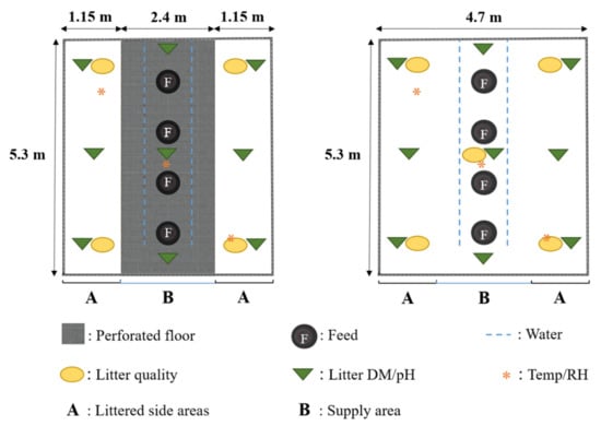 Floor plan view of the partially perforated flooring system, with an elevated perforated area in the section of feed and water supply, and the littered flooring system, including measurement positions for litter quality, litter dry matter (DM), litter pH (pH), air temperature (Temp), and relative air humidity (RH).