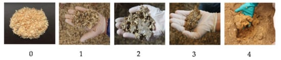 In all three fattening periods, litter quality was assessed on days 7, 14, 21, and 28 using the scoring system developed by Welfare Quality® [35]. Figure 2 shows the positions where litter quality was evaluated. A total of five litter samples were taken in the littered control barn, with four samples in the littered side areas and one sample in the supply area. In the experimental barn, four litter samples were taken in the littered side areas. No litter quality assessment was performed underneath the perforated area in the supply area of the experimental barn. Underneath the perforated area, mainly excrements are stored, which cannot be defined and evaluated as litter. A scoring system from 0 to 4 was used to evaluate the litter quality [35]. Figure 3 illustrates the images of the different scores. Score 0 was equal to “completely dry and flaky, that is, moves easily with the foot”; score 1 was equal to “dry but not easy to move with foot”; score 2 was equal to “leaves imprint of foot and will form a ball if compacted, but ball does not stay together well”; score 3 was equal to “sticks to boots and sticks readily in a ball if compacted”; and score 4 was equal to “sticks to boots once the cap or compacted crust is broken.”