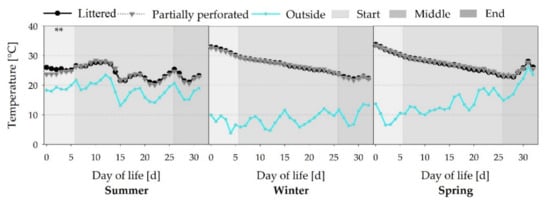Figure 4 shows typical Temp curves with a decreasing Temp towards the end of the fattening periods (all p < 0.001). During the summer fattening period, no additional heating sources were used. Therefore, the barn Temp of the summer fattening period was more oriented to the outside Temp. The initial Temp differences between both floor types in the summer fattening period are due to the settings of the climate computer (p < 0.01).