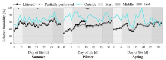 Average daily relative air humidity inside the broiler houses with two different floor types, and the outside environment RH measured over three different fattening periods (n = 144 values per day and barn). Significant differences between both floor types within the three different sections (start, middle, end of the fattening period) are marked by asterisks: * p ≤ 0.05, *** p < 0.001.