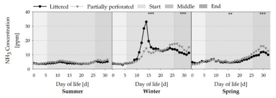 Average daily ammonia (NH3) concentrations from broiler houses with two different floor types measured over three different fattening periods (n = 480 values per day and barn). Significant differences between both floor types within the three different sections (start, middle, end of the fattening period) are marked by asterisks: ** p < 0.01, *** p < 0.001.