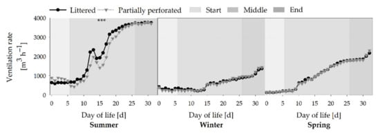 A typical course with an increasing VR towards the end of the fattening periods is shown in Figure 7 (all p < 0.001). Depending on the seasons, the highest VR is shown in the summer compared with the winter and spring fattening periods (all p < 0.001). Differences between both floor types in the middle section of the summer fattening period are due to the settings of the climate computer (p < 0.001). The VR is a preset parameter of the climate computer, resulting in parallel VR curves.