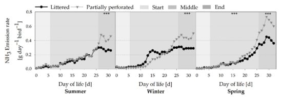 Figure 8 shows a common NH3 ER increase over the time for all fattening periods (all p < 0.001). Overall, the average NH3 ER of the three fattening periods was lower for the littered control barn (0.15 ± 0.12 g day−1 bird−1) compared with the partially perforated flooring system (0.19 ± 0.19 g day−1 bird−1). These differences were especially observed towards the end of the fattening periods, with a lower NH3 ER for the littered control barn than for the partially perforated flooring system (all p < 0.001). Drifting apart of the NH3 ER between the two flooring systems began on days 26, 22, and 18 for the summer, winter, and spring fattening periods, respectively. Furthermore, a stagnation of the NH3 ER could be observed in the end section of the littered control barn in the summer and winter fattening periods.