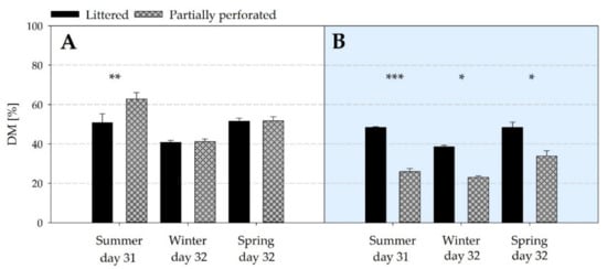 The average litter DM at the end of the fattening periods is shown in Figure 9. At the end of the summer fattening period, litter DM was higher in the barn with the partially perforated flooring system compared with litter flooring (p = 0.004). In the supply area, litter DM was always lower for the partially perforated flooring system (all p < 0.032).
