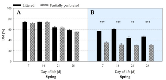 Average dry matter (DM) contents of litter samples from (A) the littered side areas and (B) the supply area (n = 6 values per day and barn in area (A); n = 3 values per day and barn in area (B)) from broiler houses with two different floor types measured over the spring fattening period. Significant differences are marked by asterisks: ** p < 0.01, *** p < 0.001.