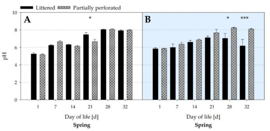 Average pH values of litter samples from (A) the littered side areas and (B) the supply area from broiler houses with two different floor types measured over the spring fattening period (n = 6 values per day and barn in area (A); n = 3 values per day and barn in area (B)). Significant differences are marked by asterisks: * p ≤ 0.05, *** p < 0.001.