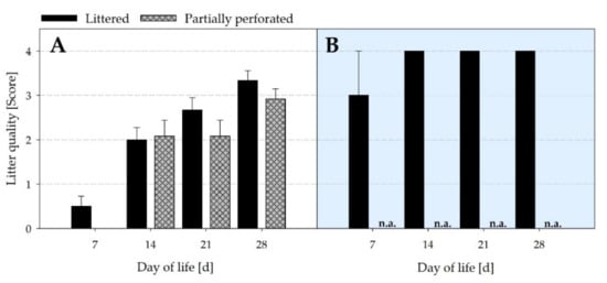 Mean scores of litter quality from (A) the littered side areas (n = 12 values per day and barn) and (B) the supply area (n = 3 values per day and barn) from broiler houses with two different floor types. n.a. = not assessed (no litter quality assessment underneath the perforated area in the supply area of the experimental barn).