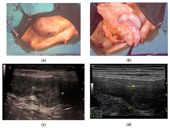 Clinical history of the PEH cases showed one or more episodes of pseudopregnancy (D1, D2) after previous heat. Case D1 showed again pseudopregnancy signs after removal of the genital tract. They were seen in heat 1.5 or 2 months before the admission and were not mated. The female dogs were asymptomatic with blood parameters into the normal ranges. Surgery was done for anticonception purposes (D1, D3, D6). Case D2 presented an inguinal hernia that at surgical correction revealed a uterine content (Figure 1a,b).
