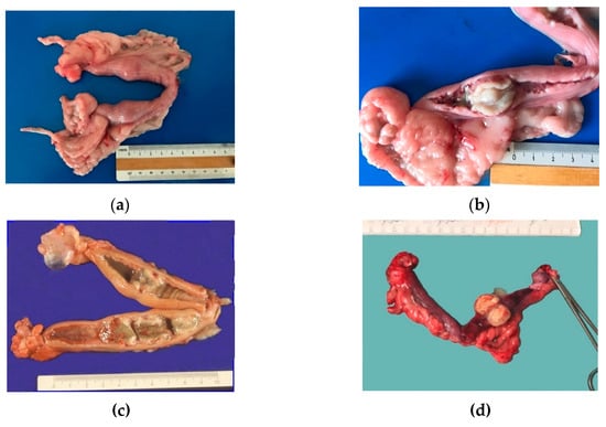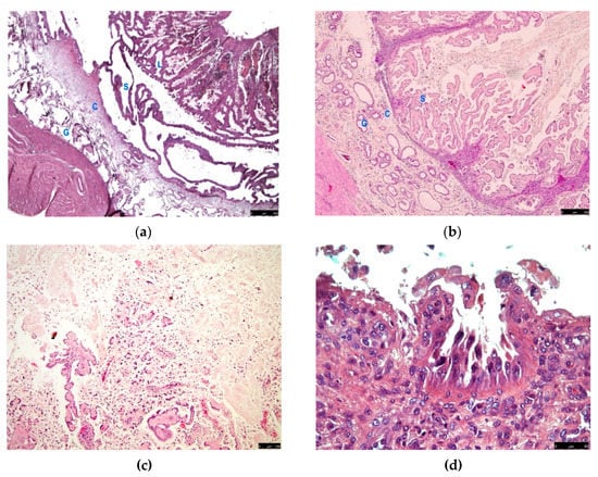 On the cut section, the uterine mucosa was reddish and thickened, especially at the swelling level, where a soft white-greyish tissue was detected on the mucosa along with cloudy fluid in the lumen. The mass, impeding spontaneous drainage, caused modest fluid accumulation in case D2. The uterine mucosa in PEH appeared as covered by many yellowish-white villous protrusions that formed cylindrical bands occluding the lumen (Figure 2b–d).