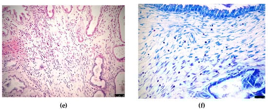 In the luminal layer, numerous degenerative changes were found, such as cell exfoliation and coagulative necrosis. As a result, necrotic debris admixed with mucoid endometrial secretions partially replaced the inner layer in some cases (D2, D5, D6) (Figure 3c,d).