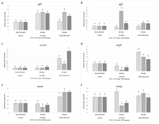 Expression profiles of genes involved in growth: (A) igf1, (B) igf2, (C) mstnb, (D) myf5, (E) myod, and (F) myog. Relative mRNA levels were evaluated in zebrafish larvae (30 dph), juveniles (60 dph), and adults (90 dph) fed with V instar and prepupae diets compared to controls fed with a diet containing fishmeal as the main protein source. Data are expressed as mean ± S.D. (n = 6). Different letters indicate significant differences in transcript levels among experimental groups within the same sampling time (p < 0.05).