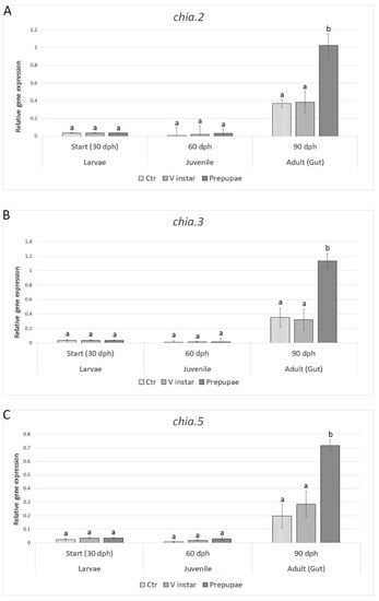 Expression profiles of genes associated with chitin hydrolysis: (A) chia.2, (B) chia.3, and (C) chia.5. Relative mRNA levels were evaluated in zebrafish larvae (30 dph), juveniles (60 dph), and adults (90 dph) fed with V instar and prepupae diets compared to controls fed with a diet containing fishmeal as the main protein source. Data are expressed as mean ± S.D. (n = 6). Different letters indicate significant differences in transcript levels among experimental groups within the same sampling time (p < 0.05).