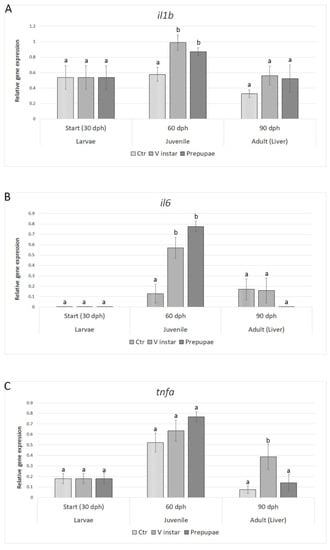 Expression profiles of genes involved in immune response (A) il1b, (B) il6, and (C) tnfα. Relative mRNA levels were evaluated in zebrafish larvae (30 dph), juveniles (60 dph), and adults (90 dph) fed with V instar and prepupae diets compared to controls fed with a diet containing fishmeal as the main protein source. Data are expressed as mean ± S.D. (n = 6). Different letters indicate significant differences in transcript levels among experimental groups within the same sampling time (p < 0.05).