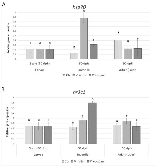 Expression profiles of stress-related genes (A) hsp70 and (B) nr3c1. Relative mRNA levels were evaluated in zebrafish larvae (30 dph), juveniles (60 dph), and adults (90 dph) fed with V instar and prepupae diets compared to controls fed with a diet containing fishmeal as the main protein source. Data are expressed as mean ± S.D. (n = 6). Different letters indicate significant differences in transcript levels among experimental groups within the same sampling time (p < 0.05).
