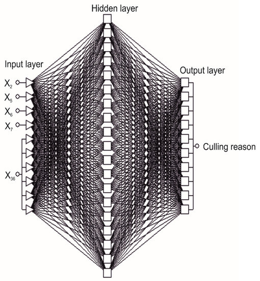 In this dataset, the following explanatory (input) variables were included: X1—herd-size (from 3 to 1644 cows), X2—age at first calving (from 17 to 34 months), X3—lactation length (in days), X4—the number of first-lactation test-day records, X5–X7—Wood’s model parameters (a, b, c, respectively) for individual categories (age at first calving × culling reason). Additionally, the following production traits for the first lactation were used as predictors (minimum, maximum, mean values, and standard deviations, respectively): X8–X11—daily milk yield (kg), X12–X15—fat content (%), X16–X19—protein content (%), X20–X23—lactose content (%), X24–X27—dry matter content (%), X28–X31—urea content (mg/L), and X32–X35—somatic cell count (thousand/mL). Moreover, first-lactation nominal variables such as X36—calving difficulty (according to the scale used for performance recording: easy, spontaneous, difficult, very difficult, abortion, and cesarean section) and X37—calving season (spring from 21 March to 20 June, summer from 21 June to 21 September, autumn from 22 September to 22 December, and winter from 23 December to 20 March) were included in the model.