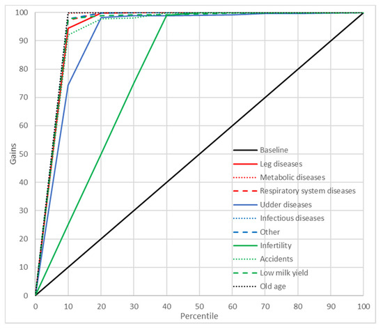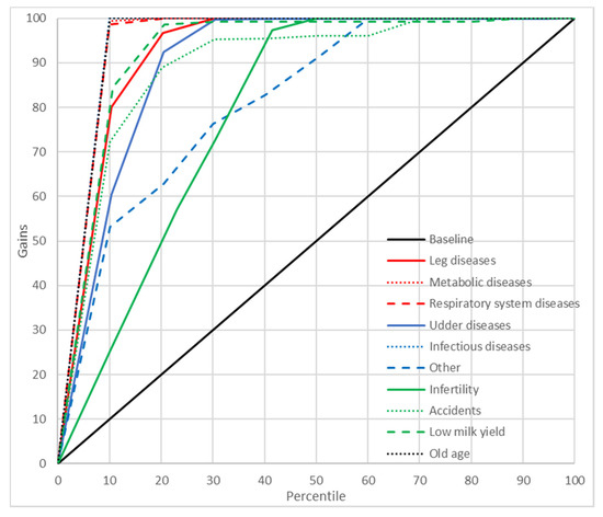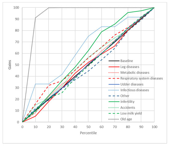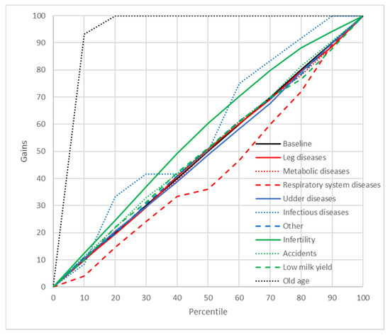 Gains chart for the culling reasons predicted by the multilayer perceptron with one hidden layer and five input variables (MLP5). Black, reference line corresponding to a model without discriminatory power.