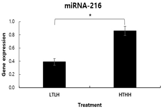 The abundance of miR-216 gene expression was affected by low- and high-temperature and humidity, being higher in the HTHH group (p < 0.05) than in the LTLH group (Figure 1).