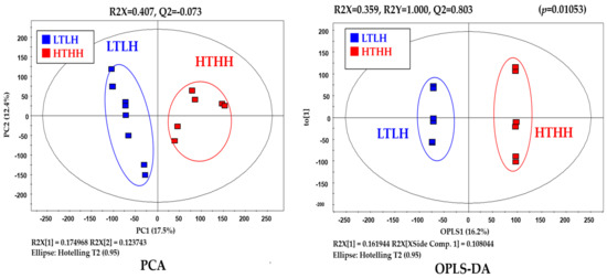 Pre-processing and statistical analysis of metabolomics data were carried out in accordance with a previous study [15]. Raw data collected through the GC-TOF-MS were converted to CDF (NetCDF) files with the LECO CROMA TOF software (version 4.44; LECO Corporation, accessed on 3 July 2020). For alignment, retention time correction, we used the online METALIGN software package (http://www.metalign.nl, accessed on 12 July 2020). Then, the final data were converted into an excel file. The data were placed in a three-dimensional matrix, utilizing information regarding peaks, peak areas, and sample names. The SIMCA-P+ software (version 12.0, Umetrics, Umea, Sweden, accessed on 20 July 2020) was used for multivariate statistical analysis. Unsupervised principal component analysis (PCA) was conducted, in order to investigate the general aggregate status and trends of other groups in all samples. After that, a supervised orthogonal partial least-squares discriminant analysis (OPLS-DA) model was used, in order to identify metabolomics that significantly differed, by maximizing the metabolomics changes between different groups. Variables were differentiated by variable importance in the projection (VIP) values. The statistical analyses were conducted based on the GLM procedure of SAS (Studio Version, SAS Institute Inc., Cary, NC, USA). All data were subjected to student’s t-tests (two-tailed) for comparisons between the means of the different groups. For the traits that were repeatedly measured, such as milk yield and behavioral data, the repeated measure analysis was performed, while the distribution of animals into treatments was considered as a random effect. Initial milk yield, compositions, and blood metabolites of the lactating cows showed no significant differences after the initial statistical analysis. Therefore, the continuous variable (covariate) was removed from the model. Analysis of covariance was utilized for correcting treatment means, controlling the experimental error, and increasing precision. Variance and covariance assumption structures, including AR(1), UN, CS, ANTE(1), TOEPH, ARH(1), and so on, were tested; the covariance structure that resulted in the lowest values for the Akaike information criteria was selected for the final analysis, due to its good fit to our design. Differences between the two subsets of data were considered statistically significant at p-values less than 0.05, while values between 0.05 and 0.10 were considered to indicate a significant trend tendency.