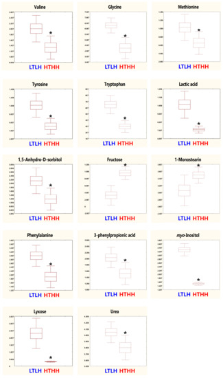 Metabolomics in dairy cows (n = 4) exposed to two distinct environmental conditions. Serum was assessed. LTLH vs. HTHH; VIP > 1.0, p < 0.05. Values (mean ± SEM) with asterisk (*) differ significantly, compared to the LTLH group (p < 0.05).