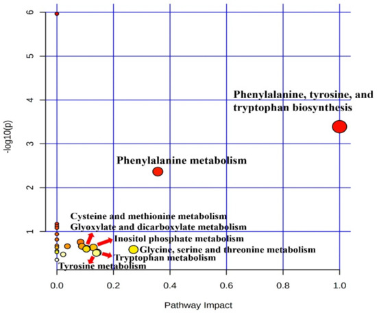 Metabolic raw data of sera were collected for a multivariate statistical analysis. The status of metabolites in the LTLH or HTHH groups was determined in the score plot for PCA from serum (Figure 2). The distribution of metabolite parameters in serum (R2X = 0.359, R2Y = 1.000, Q2 = 0.803, p = 0.0105) showed a clear separation in the OPLS-DA model (Figure 2). According to the OPLS-DA analysis, potential metabolic markers were separated from the serum, based on a value of importance in the projection higher than 1.0 (VIP > 1.0). As a result, valine, methionine, phenylalanine, tyrosine, tryptophan, lactic acid, 3-phenylpropionic acid, 1,5-anhydro-D-sorbitol, myo-inositol, and urea were found to be decreased, while fructose and 1-monostearin were increased significantly (p < 0.05) in the HTHH group, compared with that in the LTLH group (Figure 3). For the pathway analysis, the online MetPa system (METABOANALYST 4.0, http://www.metaboanalyst.ca/, accessed on 16 January 2021) was used. Metabolites with significant changes were introduced into this online system, in an attempt to generate the metabolome view list. Bos taurus was selected for pathway analysis in the model organism interface. Targets were selected based on both impact value (not below 0.1) and p-value (no more than 0.05). Figure 4 shows the map regarding relevant metabolic pathways, while the function pathway results are presented in Table 8. As shown in Table 8, phenylalanine, tyrosine, and tryptophan biosynthesis (p < 0.001) and phenylalanine metabolism (p = 0.004) pathways were highly downregulated.