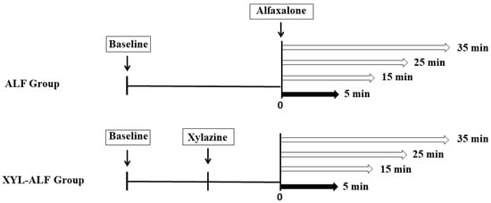 Study timeline illustrating the time of anesthetic induction with IV alfaxalone alone (ALF group) (n = 6) and with alfaxalone following IV xylazine administration (XYL-ALF) (n = 6). The data collection time points were at baseline and at 5, 15, 25 and 35 min after alfaxalone. The pedal withdrawal reflex and end tidal carbon dioxide (PE’ CO2) were recorded only at 5 min after alfaxalone administration (black arrows).