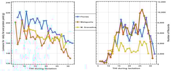 The results of the previously defined fixed effects models were highly significant (p < 0.001) in each of the three breeds studied. The least square means for THI effects for each breed are presented in Figure 1, as well as the distribution of the number of records available.