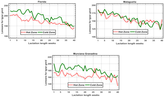 The adjusted least square means for each breed, showing the results of the first 280 days of lactation in two extreme climatic zones (hot and cold) are shown in Figure 2.