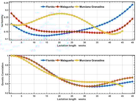The genetic parameters for fpy throughout the DIM scale estimated by Model 1 are presented in Figure 3, in which it is evident that h2 manifested the same pattern during the first 30 weeks for FL and Ma, while for MG the result was different, with an increased h2 value from the first week up to week 25 and decreasing later. The genetic correlations showed the same results for the three breeds, with values that decreased as the differences between the first week and the rest of DIM increased.