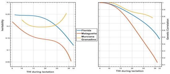 In the context of the RRM model applied, the results were expressed in terms of a gf. In our study an order r = 2 was used and, therefore, these gfs were made up of three elements with very precise biological meaning: an intercept (ao) that defines the animal’s general genetic level for production, a slope (as) defining the animal’s ability to react and change the level of production, and a quadratic term (aq) that modifies (accelerating or decreasing) the effect of the slope. Our results in Table 5 show a positive correlation between ao for the three breeds, meaning that if the selection process favored these components the genetic level of the animal increases along the scales of DIM and THI, but at the same time the correlated response is negative due to an antagonist correlation between ao and as. As a consequence, the results suggest more productive animals but with less adaptation to change in THI, which is an expression of Ige in line with the same general conclusions presented by Misztal []. The results of the genetic correlations between the fpy at different levels of THI or DIM trajectories found in this study (Figure 3 and Figure 4) agree with previous studies showing the same decreasing pattern for dairy traits in goats []; sheep [,] and dairy cattle [,] and cannot be considered as the same traits across both scales.