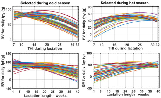 As an example of the importance of previous results we selected the best 500 animals from the Florida goat breed, according to their original BV for fpy both in the cold zone and in the hot zone, as previously defined (the results Ma and MG were similar but in Supplemental Figures S1 and S2 more general informative figure are presented). Figure 5 shows the evolution of the BV for a large group of these selected animals for each point of THI (upper part of Figure 5). Only 63% of the animals were the best in both cold and hot zones, while the BV of animals selected in the cold season decreased along THI, but the response of the best animals selected in the hot season ed the opposite direction. Interesting results were observed for the response of the same animals selected in the cold and hot seasons, but along the trajectory of DIM (lower part of Figure 5), which follows the same previous pattern.