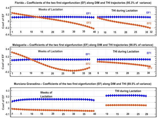 The results obtained with this PCA (Figure 6) indicate that the first two eigenvectors (evi) explain almost all the variances between the estimates of the animals’ BV throughout the scales of DIM and THI in the three goat breeds. Since the evi are orthogonal, we can add their effects in a single Ipc index, which considerably reduces the number of variables, retaining most of the (co)variance of each one. These evi values are the coefficients of the eigenfunction (efi) for the fvt traits defined by Kirkpatrick and Meyer [] and provide the basis of this Ipc, which can improve the selection process considerably.